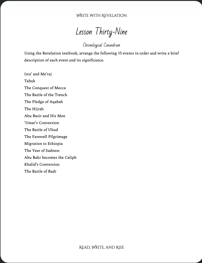 A great curriculum to dive into Prophet Muhammad's (peace be upon him) biography while simultaneously improving your students' writing skills. This writing companion uses a textbook titled Revelation, The Story of Muhammad, Peace Be Upon Him, by Dr. Meraj Mohiuddin. The twenty lessons in this PDF curriculum include various writing activities inspired by the content in the textbook. Writing activities include but are not limited to copywork, spelling, vocabulary, self-reflection, summarizing, critical thinking, narratives, public speaking, outlining, notetaking, grammar, and poetry.